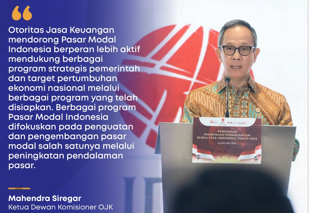 JAKARTA, MEDIABARU.CO.ID — 2 Januari 2025,  Otoritas Jasa Keuangan (OJK) terus mendorong pasar modal Indonesia untuk berperan lebih aktif dalam mendukung berbagai program strategis pemerintah, serta target pertumbuhan ekonomi nasional. Hal ini disampaikan oleh Ketua Dewan Komisioner OJK, Mahendra Siregar, dalam sambutannya pada acara pembukaan Perdagangan Bursa Efek Indonesia di Gedung Bursa Efek Indonesia, Jakarta. Menurutnya, pasar modal harus menjadi pilar penting dalam menciptakan pertumbuhan ekonomi yang berkelanjutan dan menguatkan ekonomi Indonesia di kancah global.