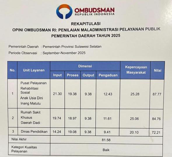 “Pelayanan publik di lingkup Pemprov Sulsel tahun 2025 mendapatkan Opini Kualitas Tinggi dari Ombudsman Republik Indonesia. Hasil ini merupakan baseline untuk opini selanjutnya, karena secara kuantitatif masih terdapat rentang yang cukup jauh menuju opini kualitas tertinggi,” kata Ismu, Rabu (1/4/2026).